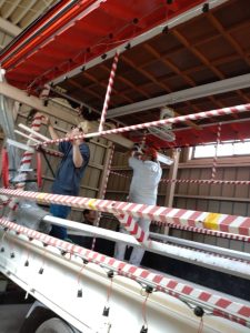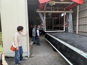 本日、山車を運ぶためのトラックに実際に山車を載せてみる試験を行い、
